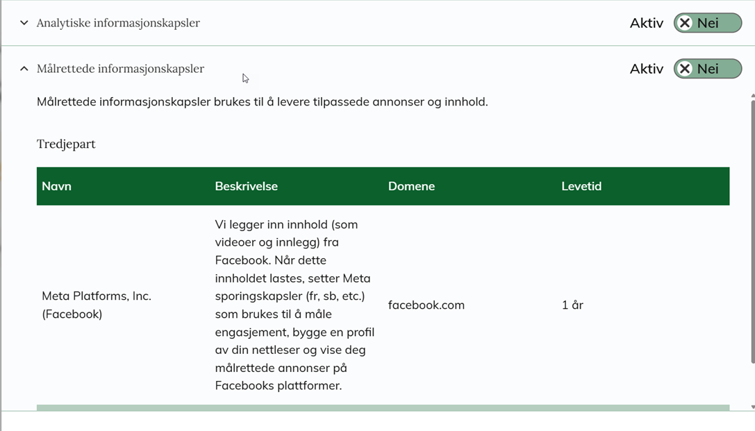 Formål: Vi legger inn innhold (som videoer og innlegg) fra Facebook. Når dette innholdet lastes, setter Meta sporingskapsler (fr, sb, etc.) som brukes til å måle engasjement, bygge en profil av din nettleser og vise deg målrettede annonser på Facebooks plattformer.