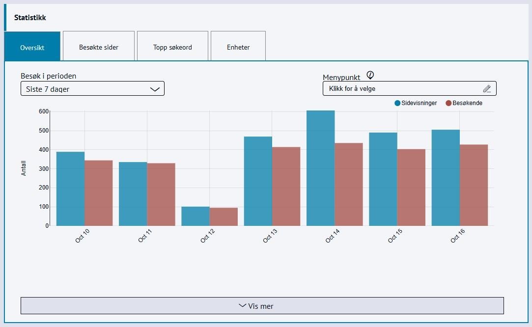 StatistikkStatistikkfunksjonen gir deg oversikt over trafikken på nettstedet – både for enkeltsider, menypunkter og hele portalen.Legge til statistikk-widget på dashboardLogg inn i ACOS CMSStå på HjemKlikk Rediger dashboard øverst til høyreKlikk Legg til widgetSøk etter Statistikk og klikk OKWidgeten gir oversikt over:Trafikk de siste 7 dagene, 30 dagene, 3–12 månedeneMest besøkte siderSøkeord med og uten treffFordeling mellom mobil og desktopFor detaljer: Klikk Vis mer for å åpne full rapport eller laste ned til Excel.Se statistikk for en artikkelÅpne artikkelen i editorKlikk på fanen Statistikk øverst i artikkelenKlikk Vis mer for detaljert visningForklaring av begreperSidevisning: Hver gang en side lastes i nettleseren. En oppdatering (F5) teller som ny visning.Besøkende: En unik brukerøkt. En besøkende kan stå for flere sidevisninger i samme økt.Forstå de ulike faneneKlikk for stort bildeOversiktViser totaltrafikk for valgt periodeSe statistikk for hele nettstedet eller velg et bestemt menypunktKlikk Vis mer for detaljerte tallBesøkte siderViser hvilke sider som har flest, minst eller ingen besøkMulig å filtrere etter periodeKlikk Vis mer for detaljert oversikt og eksportTopp søkeordViser søkeord som brukes i nettstedets interne søkViser søkeord med og uten treffKlikk Vis mer for å se klikkfrekvens: Hvor mange som klikker på et søkeresultat etter å ha søktEnheterViser hvor mange besøk som kommer fra mobil og desktopOfte stilte spørsmål Kan jeg hente ut statistikk for egendefinert periode (f.eks. hele 2021)?I CMS kan du se perioder opp til 12 måneder tilbake.For eldre eller mer detaljerte data, bruk et eksternt statistikkverktøy.Du kan eventuelt eksportere statistikken som en Excel-fil for eksempel en gang i året.Hvilken metode brukes for innsamling?ACOS CMS logger data direkte i systemet uten eksterne tjenester.Det brukes ingen tracking-cookies, og ingen personopplysninger lagres.Hver sidevisning logges med SessionID, User agent, skjermstørrelse, dato og ressurs (for eksempel artikkel eller menypunkt).