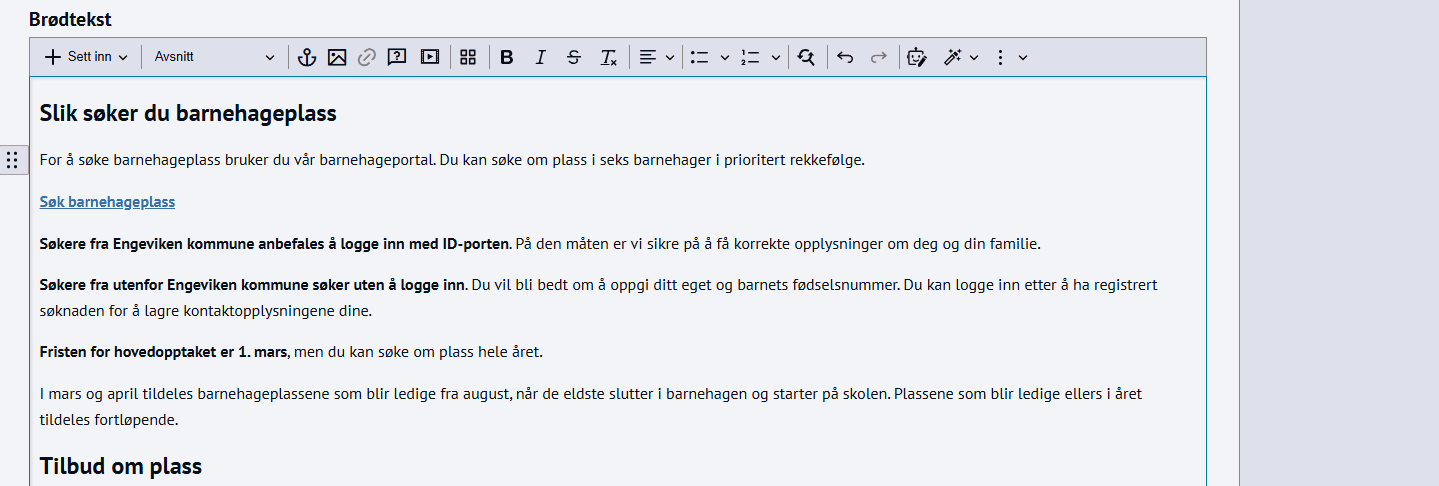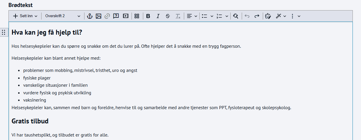 AI-assistentenAI-assistenten hjelper deg å skrive bedre og raskere i ACOS CMS. Steg for steg Inspirasjon Bestill Bruk innebygget språkmodell i CMSDu kan la vår AI-assistent skrive artikkelen for deg direkte i grensesnitttet.Klikk for stort bilde💡 Kort fortaltAI-assistenten bruker OpenAI, samme teknologi som ChatGPT. Du kan redigere, erstatte eller legge inn tekstforslag direkte i brødteksten – uten å forlate CMS.Slik lager du ny tekst med AIÅpne artikkelen og klikk i ingress eller brødtekstTrykk på Robotikonet i verktøylinjen som heter AI-assistentenSkriv inn promptEt tips er å sette skrive en prompt som sier noe om:hvem som skriver teksten (webredaktør i kommune) mottakere av teksten (innbyggere)budskapet i teksten (løse brukeroppgave i en konkret tjeneste)Klikk for stort bildeFå hjelp til eksisterende tekstDu kan også få hjelp til endringer i eksisterende tekst.Marker teksten du vil endre påTrykk på Robotikonet i verktøylinjen som heter AI-assistentenSkriv inn promptKlikk for stort bildeSlik bruker du ferdige kommandoerDu kan også bruke hurtigkommandoer som ligger inne i AI-kommandioer.Åpne artikkelen og marker teksten du vil ha hjelp tilTrykk på Tryllesymbolet i verktøylinjen som heter AI-kommandoerVelg kommando fra nedrekkslistenKlikk for stort bildeSikkerhet og databehandlingOpenAI bruker ikke innsendt data til å trene sine modellerData lagres maks 30 dager for å forebygge misbrukDu kan be OpenAI slette dataene dineACOS lagrer ingen data fra AI-assistenten på egne servereCKEditor 5 (som AI-assistenten er en del av) driftes som del av ACOS CMS-plattformen📘 Det er ikke nødvendig med egen databehandleravtale. Eksisterende avtaler med ACOS dekker bruk av AI-assistenten.Ofte stilte spørsmål Hvor henter assistenten kunnskap fra?Assistenten baserer seg på generell kunnskap frem til april 2023 og kan søke på nett via Bing.Den har ikke informasjon om din kommune eller organisasjon med mindre du beskriver det i prompten.Må jeg legge inn betalingskort hos OpenAI?Ja. Bruken faktureres direkte fra OpenAI.Du legger inn kortinformasjon under Settings → Billing i din OpenAI-konto.Les mer om bestilling og aktivering ved å klikke på Bestill-fanen øverst i artikkelen.Er det risiko ved bruk av AI-assistenten?Som alltid ved tredjepartstjenester:Ikke legg inn sensitiv informasjonBeskytt API-nøkkelen din (den er synlig for innloggede administratorer)Vær bevisst på kildekritikk og fakta Eksempler på prompts ✅Kopier og lim inn i AI-assistenten: Skrive førsteutkastDu er webredaktør i en norsk kommune. Skriv en nettsidetekst i klarspråk rettet mot innbyggere. Temaet er hvordan man søker om redusert foreldrebetaling i barnehage.Teksten skal:starte med det viktigste førstforklare hvem som kan søkeforklare hva man trenger å gjøre, steg for stegha korte avsnitt og tydelige mellomtitlerUnngå fagspråk og interne begreper. Forbedre tekstForbedre teksten jeg har markert. Du er webredaktør i en kommune og skriver for innbyggere. Gjør språket:enklere å forståmer direkte og aktivtbedre strukturert med kortere setningerBehold innholdet, men gjør teksten tydeligere og mer brukervennlig. Tilpasse tekst til målgruppe og formålSkriv om teksten slik at den hjelper innbyggere raskt å forstå hva de må gjøre. Teksten gjelder bestilling av time hos saksbehandler i kommunen.Fokuser på:hva innbyggeren kan få hjelp tilhvordan de går frem for å bestille timehva som skjer etter at de har bestilt timeSkriv i klarspråk og unngå unødvendig informasjon. Ferdige kommandoer ✅Du kan skrive egne kommandoer, eller velge blant disse i menyen:Tekstforbedring Tekstforbedring AI-assistentenKommandoBeskrivelseForbedre skrivingRetter språk og grammatikkGjør kortereFjerner overflødig tekstGjør lengreLegger til mer detaljerForenkle språketGjør teksten enklere å forstå Struktur StrukturKommandoBeskrivelseLag avsnitt og overskrifterDeler opp tekst og lager mellomtitlerFjern formateringFjerner tabeller, farger og stiler Stil Stil Ai assistentenKommandoBeskrivelseForretningEndrer tonen i tekstenJuridiskEndrer tonen i tekstenJournalistiskEndrer tonen i tekstenPoetiskEndrer tonen i teksten Oversetter OversettelserKommandoBeskrivelseNorsk bokmålOversetter teksten til valgt språkNorsk nynorskOversetter teksten til valgt språkEngelskOversetter teksten til valgt språkEtc.Oversetter teksten til valgt språk Genererer fra utvalg Generer fra utvalg - ai assistentKommandoBeskrivelseOppsummerLager korte sammendrag eller fortsetter tekstenFortsettLager korte sammendrag eller fortsetter teksten Tips for bruk💡Kvalitetssikre alltid teksten.AI kan skrive feil, være unøyaktig eller bruke utdaterte data.Ikke legg inn sensitiv eller konfidensiell informasjon.Tekst du skriver inn sendes til OpenAI via et sikkert API, men data skal ikke inneholde personopplysninger.Sjekk interne retningslinjer.Kontroller at bruk av OpenAI samsvarer med din organisasjons policy for kunstig intelligens. Denne modulen er standard funksjonalitet i ACOS CMS. Se flere moduler du kan bestille. PrisFyll ut skjemaet, så sender vi deg et uforpliktende pristilbud.