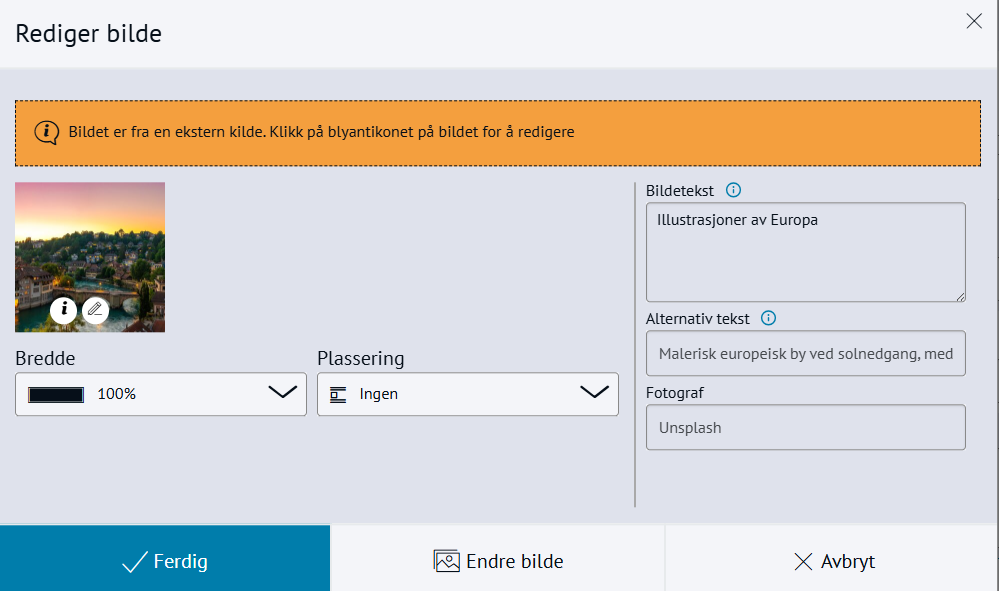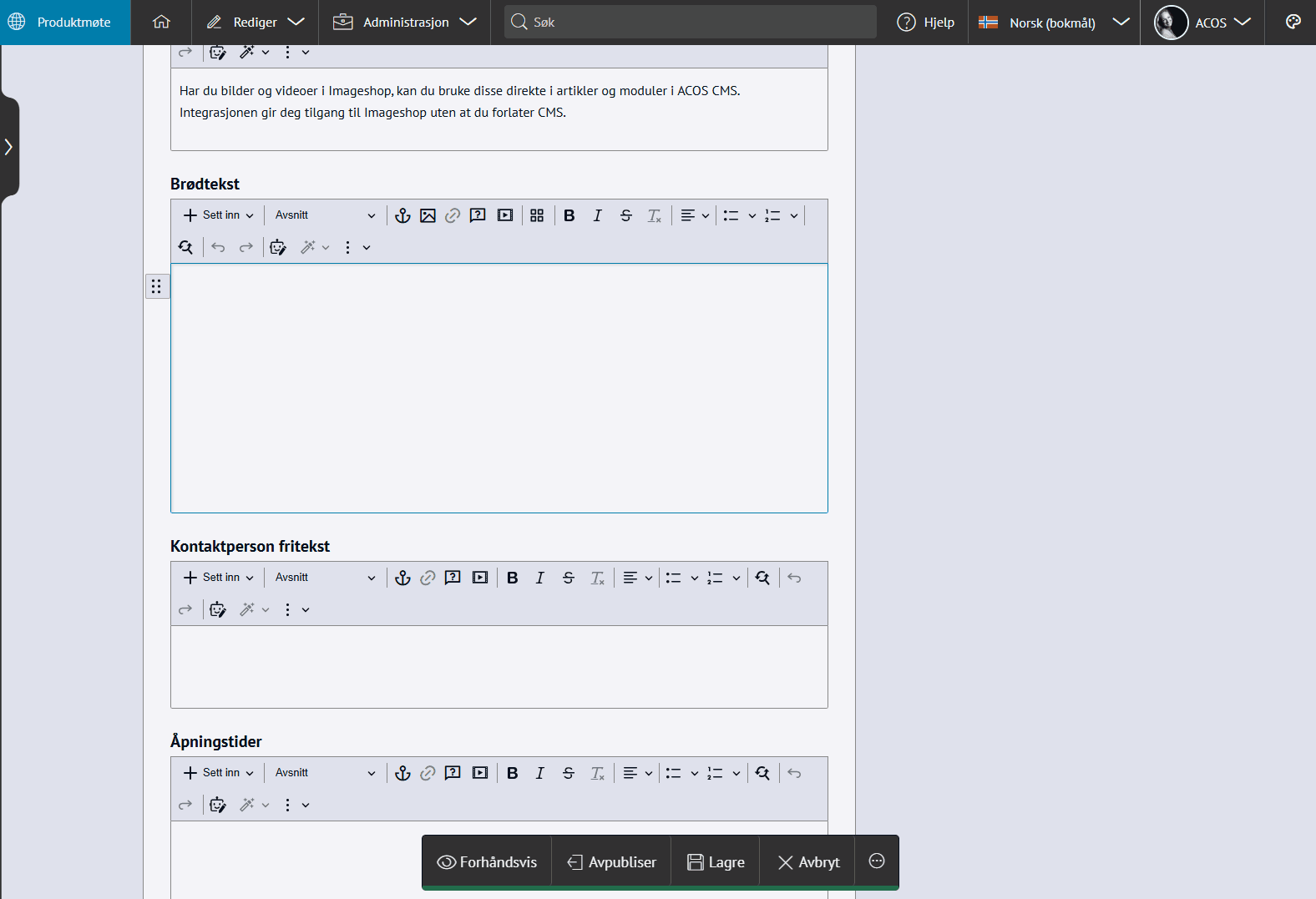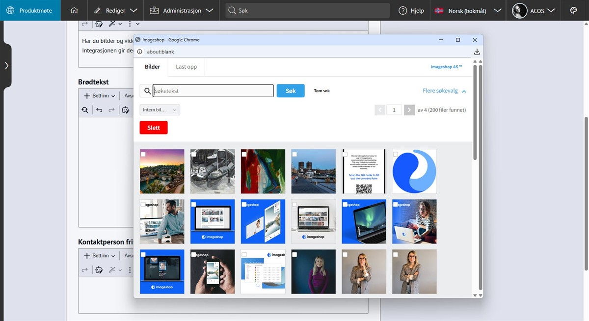 Integrasjon mot ImageshopHar du bilder og videoer i Imageshop, kan du bruke disse direkte i artikler og moduler i ACOS CMS. Integrasjonen gir deg tilgang til Imageshop uten at du forlater CMS. Om integrasjonen Bestill Sett inn bilder fra bildebankI stedet for å laste opp bilder i ACOS CMS fra datamaskin, kan du hente bilder fra bildebanker som Imageshop.Trykk for stort bildeSlik fungerer integrasjonenSett inn bilder og video fra Imageshop i artikler og på andre sider som har bildefeltEnkel og rask tilgang til høykvalitets mediafiler, bilder og videoer fra ImageshopTidsbesparende å importere bilder direkte til artikler og innholdSporbarhet på hvor bildet er benyttet både fra Imageshop og i CMSRediger bilder fra ACOS CMSNår du laster opp bilder fra Imageshop kan du redigere bildet i grensesnittet i CMS, men på måten du er kjent med i Imageshop:Trykk for stort bildeEffektiv opplasting og bruk av bilderBilder fra Imageshop kan brukes i:artikler i brødtekst og modulerbildegalleripersonmodulensider med reserverte bildefeltpromobildetoppbilde i kalenderhendelserTrykk for stort bildeMetadata blir med automatiskNår du importerer bilder fra Imageshop til CMS får du automatisk med:BildetekstAlternativ tekstFotografPlassering Beskjæring Riktig bildestørrelseTrykk for stort bildeSette inn bilde fra ImageshopGå til artikkelen og klikk i brødteksten der du vil plassere bildetVelg +Sett inn → BildeLast opp bilde fra ImageshopSøk opp eller velg bilde og velg Sett innTrykk for stort bildeSette inn video fra Imageshop Gå til artikkelen og klikk i brødteksten der du vil plassere videoenVelg +Sett inn → WidgetVelg +Opprett ny og gi den en TittelVelg Type og Annet: Video fra ImageshopVelg video og Sett innUnder innstillinger, legg til i en kategoriKlikk Publiser og Ok I tillegg til Imageshop, har vi integrasjon mot Mediaflow. PrisFyll ut skjemaet, så sender vi deg et uforpliktende pristilbud.