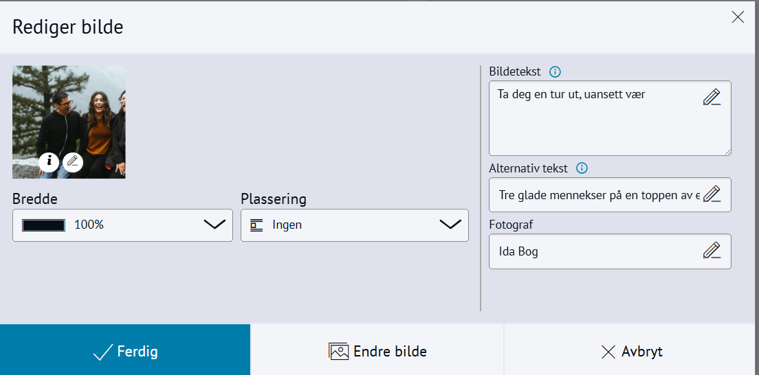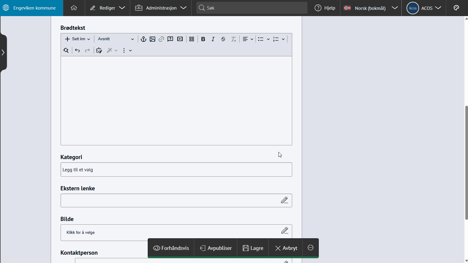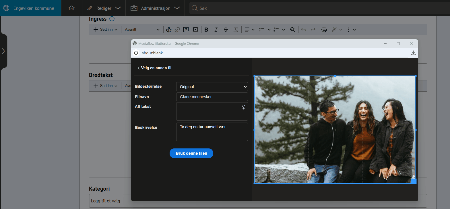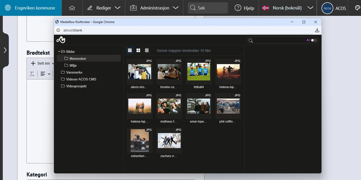 MediaflowMed denne integrasjonen kan du enkelt vise bilder og videoer fra Mediaflow på nettsiden, og redigere bildene fra ACOS CMS. Om integrasjonen Bestill Sett inn bilder fra bildebankI stedet for å laste opp bilder i ACOS CMS fra datamaskin, kan du hente bilder fra bildebanker som Mediaflow.Trykk for stort bilde Slik fungerer integrasjonenSett inn bilder og video fra Mediaflow i artikler og på andre sider som har bildefeltVis live-sendinger på nettsiden fra MediaflowEnkel og rask tilgang til høykvalitets mediafiler, bilder og videoer fra MediaflowTidsbesparende å importere bilder direkte til artikler og innholdRediger bilder fra ACOS CMSNår du laster opp bilder fra Mediaflow kan du redigere bildet i grensesnittet i CMS, men på måten du er kjent med i Mediaflow:Trykk for stort bilde Tips! 💡I Mediaflow få du automatisk genererte tekster:alt-tekster for bilderteksting av video på flere språk Effektiv opplasting og bruk av bilderBilder fra Mediaflow kan brukes i:artikler i brødtekst og modulerbildegalleripersonmodulensider med reserverte bildefeltpromobildetoppbilde i kalenderhendelser Du kan endre felter i bildet fra Rediger → Bilder i ACOS CMS:Trykk for stort bilde Integrasjonen i brukEksempler på noen som har integrasjon mot Mediaflow:Karmøy kommuneIndre Østfold kommuneØstre Toten kommune Sette inn bilde fra MediaflowGå til artikkelen og klikk i brødteksten der du vil plassere bildetVelg +Sett inn → BildeLast opp bilde fra MediaflowSøk opp eller velg bilde og velg Bruk denne filenLegg til Tittel, Bildetekst, Alt tekst og Fotograf i neste steg i ACOS CMS💡Tips: Opprett en egen bildekategori for filer fra Mediaflow. Da holder du oversikten enklere.Trykk for stort bildeSette inn video fra Mediaflow Gå til artikkelen og klikk i brødteksten der du vil plassere videoenVelg +Sett inn → WidgetVelg +Opprett ny og gi den en TittelVelg Type og Annet: Video fra MediaflowVelg video og Sett innUnder innstillinger, legg til i en kategoriKlikk Publiser og Ok I tillegg til Mediaflow, har vi integrasjon mot Imageshop. Hva gjør integrasjonen?Sett inn bilder fra Mediaflow i brødtekst, bildegalleri og alle andre reserverte bildefeltRediger bildene på samme måte som andre bilder i CMSImporter videoer som widgetsFå automatisk genererte alt-tekster for bilderFå automatisk teksting av video på flere språkOppfyller kravene til universell utforming PrisDu bestiller integrasjonen hos Mediaflow. Mediaflow tar deretter kontakt med ACOS for å sette opp integrasjonen mot CMS.Bestill integrasjonen via Mediaflow I tillegg til Mediaflow, har vi integrasjon mot Imageshop.