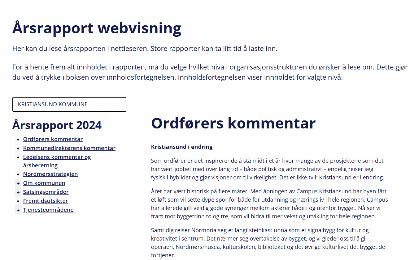 Integrasjon mot StratsysIntegrasjonen gjør det mulig å bygge inn rapporter fra Stratsys på nettsiden. Om integrasjonen Bestill Vis rapporter fra Stratys på nettsidenSkriv rapporten i Stratys og vis i kommunens designRapporten vises interaktivt på nettsidenDu får også en mobilvisning som fungerer interaktivtKlikk for stort bilde Se integrasjonen i brukKristiansund kommune - årsrapport Se også muligheter for å vise dokumenter i ACOS CMS med dokumentleseren. PrisFyll ut skjemaet, så sender vi deg et uforpliktende pristilbud.