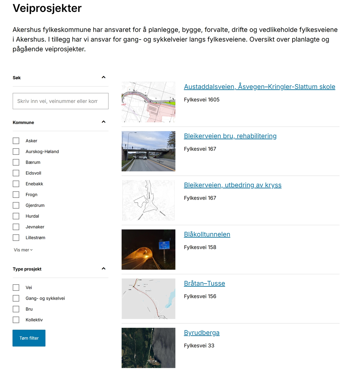 - Artikler eller menypunkt med en valgt emnetype: Velg for barnehager, skoler, omsorgsbolig, helsetilbud etc.