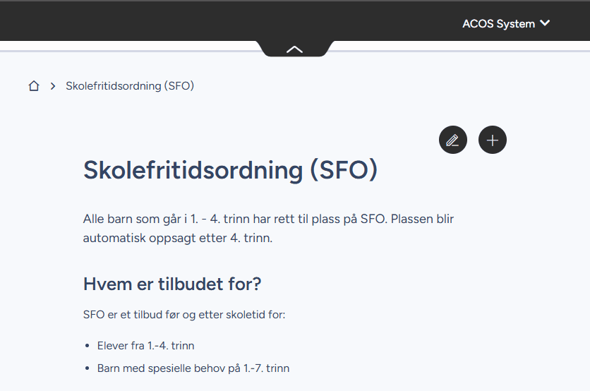 Premiummodulene i ACOS CMSVis innhold på smarte måter med premium-modulene. I premiumpakken:Brutte lenkerDirekteredigeringDokumentleserFiltervisningNabolagetTidslinjeVeiviserFå tilbud på tilleggsmodulene Brutte lenkerFanger automatisk opp brutte lenker på nettstedet ditt, slik at du kan rette dem før brukerne møter feil.Brutte lenkerKlikk for stort bildeDirekteredigeringLar deg redigere innhold direkte på nettsiden uten å gå via redigeringsvisning i CMS.Klikk for stort bilde DirekteredigeringDokumentleserViser dokumenter direkte på nettsiden som er universelt utformet, og lar brukerne laste dem ned som PDF. DokumentleserSe dokumentleser i bruk hos Horten kommuneFiltervisningHjelper brukerne å finne riktig innhold raskere ved å filtrere lister etter relevante valg.FiltervisningKlikk for stort bildeSe filtervisningen i bruk hos Haugesund kommuneNabolaget mittTilpasser innhold basert på hvor brukeren bor, slik at de får informasjon som er relevant for sitt nærområde.Nabolaget mittMeld feil - Bjørnafjorden kommuneTidslinjePresenterer hendelser, prosesser eller historikk visuelt i kronologisk rekkefølge.TidslinjeKlikk for stort bildeSe tidslinje i bruk hos Bodø kommuneVeiviserGuider brukeren steg for steg til riktig svar eller tjeneste basert på deres situasjon.Veiviser Tilbud