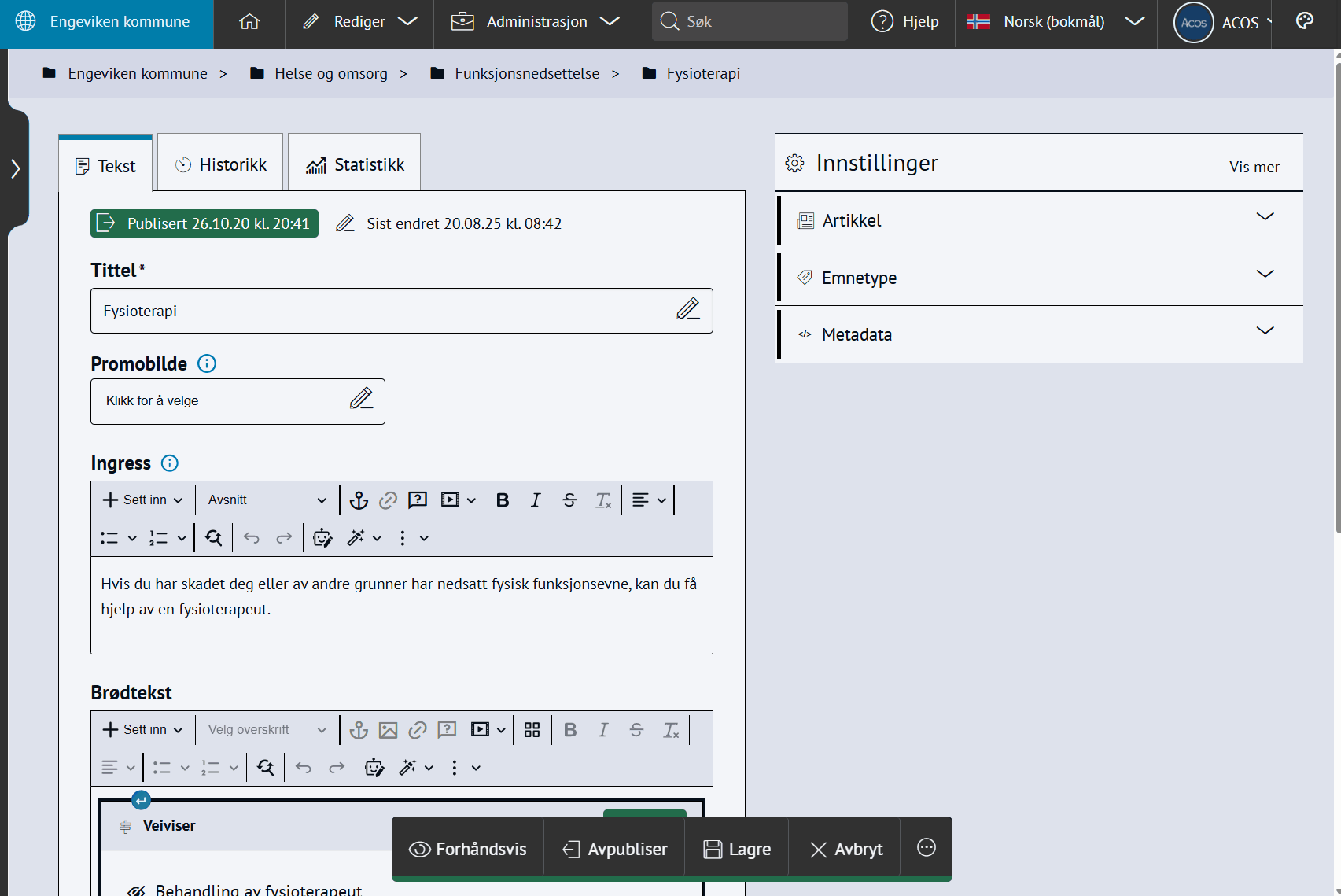 VeiviserEn veiviser hjelper brukeren med å finne svaret raskere, ved å veilede dem gjennom noen enkle spørsmål. Brukeren får presentert relevant informasjon, fremfor å lese igjennom mye tekst. Steg for steg Inspirasjon Bestill Lage en veiviserGå til artikkelen og klikk i brødteksten der du vil ha veiviserVelg +Sett inn → VeiviserVelg +Opprett ny og gi den en TittelUnder Kategori velger du en plassering eller oppretter en ny fra flervalgsknappen (…)Fyll inn Forklarende tekst ved behovSkriv inn et Spørsmål Fyll ut Veivalg og Resultat som sammen utgjør veiviseren.Klikk Lagre 👉🏻 Veiviser består av:Spørsmål du kan stille brukeren [Hvilken twist liker du best?]Veivalg med alternativer [Lakris, banan, daim, en av de andre]Resultat der brukeren får svaret [Daim er en god nummer to!]Redigere en veiviser Redigere veiviserDu kan endre en veiviser på to måter:Åpne artikkelen og dobbeltklikke på veiviseren Gå til Rediger > VeiviserTrykk på bildet for større visning.Kopiere veiviserKopiere steg i veiviserenKlikk på steget du vil kopiereKlikk på flervalgsknappen (...)Klikk på Lag kopiTrykk på bildet for større visning.Kopiere hele veiviserenGå til Rediger > VeiviserKlikk på flervalgsknappen (...)Klikk på Lag kopiFlytte stegKlikk på steget du vil flytteKlikk og dra flyttikonetSlipp mellom de andre stegeneTrykk på bildet for større visning.Slette stegKlikk på steget du vil sletteKlikk på flervalgsknappen (...)Velg Slett og OKOfte stilte spørsmål og feilsøking Hvordan kan jeg teste veiviser før jeg publiserer?Legg den inn i en artikkel og trykk på forhåndsvisning av artikkel. Se hvor modulen er i brukDu kan enkelt sjekke om modulen er i bruk eller ikke.Gå til Rediger > velg modulen du vil sjekkeVelg en kategoriKlikk på flervalgsknappen (...) Velg Hvor i brukTrykk på bildet for større visning. Når bør du bruke veiviser?Komplekst regelverk for skole✅Akershus fylkeskommune hjelper brukerne med å finne ut om de har rett på gratis skoleskyss, fremfor å henvise brukerne til komplekst regelverk. Se veiviseren i bruk hos Akershus fylkeskommune Hjelpe brukeren med å sjekke om de kvalifiserer✅Akershus fylkeskommune hjelper brukerne med å finne ut om de kan søke om å bli praksiskandidat. Se veiviseren i bruk hos Akershus fylkeskommune Guide brukeren gjennom kompliserte brukeroppgaver✅Gjøvik kommune hjelper brukerne med å finne ut hvilke planer som gjelder for sin eiendom. Se veiviseren i bruk hos Gjøvik kommune Luke ut unødvendige søknader/klager✅Lillehammer kommune bruker veiviseren for å luke ut innsendinger av klager som ikke har en gyldig begrunnelse. Se veiviseren i bruk hos Lillehammer kommune Komplekst regelverk for bevilling✅Arendal kommune hjelper brukerne å enkelt finne ut om de må søke om skjenkebevilling for enkeltarrangement. Se veiviseren i bruk hos Arendal kommune Dette er en av modulene i premiumpakken (tilleggsfunksjonalitet i ACOS CMS). Les hva du får om du bestiller premium-modulene. PrisFyll ut skjemaet, så sender vi deg et uforpliktende pristilbud.