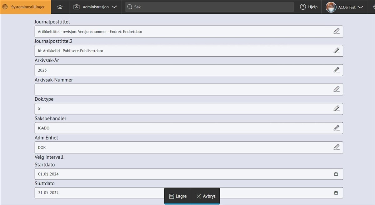 Websak - arkivering av artiklerØnsker dere en enkel og automatisert løsning for å bevare verdifullt innhold? Vår modul for arkivering av artikler fra ACOS CMS til WebSak er svaret! Slik funker det Bestill Hva sier arkivloven?Arkivloven krever at informasjon med forvaltningsmessig eller historisk verdi arkiveres, uavhengig av format – dette inkluderer innhold på offentlige nettsider.Modulen sørger for at dere møter disse kravene automatisk.Slik fungerer arkiveringenDu lager en ny arkivsak i WebSak og sender saksnummeret til ossVi legger inn standardinnstillinger for arkivering, som du selv kan endre på senereArkivering fra nettsiden til WebSak går via ACOS Mottak Arkiveringen skjer automatisk 1 gang i døgnet (kan skje oftere om ønskelig)Endringer i artikkelen lagres som en ny versjon, neste gang arkiveringen kjørerDette blir arkivertPubliserte artikler Endringer du gjør i artikkel vil lagres som en ny journalpost Innholdet i artikkelen (bilder, filer, webskjema, lenker i artikkel)Grensesnittet i ACOS CMS:Klikk for stort bildeGrensesnittet i Websak:Artiklene dine vil du finne igjen som journalposter i saken. Her anbefaler vi at du setter opp en sak pr. år. Dette kan du selv bestemme.Klikk for stort bildeGevinster for organisasjonenUnngå informasjonstap og overhold arkivloven Når modulen er satt opp, arkiveres artikler automatisk- ingen manuell oppfølging.Sikre digital kulturarv - bevar viktig informasjon for ettertiden. Artikler med historisk eller forvaltningsmessig verdi blir trygt lagret og tilgjengelig i WebSak Finn enkelt igjen eldre artikler og tidligere publisert innhold direkte i WebSak, organisert som journalposter i den saken dere definerer. Rydd med trygghet - Når artikler er forsvarlig arkivert i WebSak, kan dere med større trygghet avpublisere eller slette utdatert innhold, og du holder nettsidene relevant og brukervennlige, uten å miste historisk dokumentasjon. Har du et slankt nettsted bidrar du også til en mer bærekraftig og miljøvennlig nettside, som laster raskere og er enklere å vedlikeholde.Hvem passer det for?Alle våre ACOS CMS-kunder som benytter WebSak som ønsker en effektiv og automatisert løsning for å ta vare på verdifullt innhold fra nettsidene. ForutsetningerLøsningen gjelder for arkivering av artikler til WebSak, ikke andre sak- og arkivsystem. Dette arkiveres ikke: Informasjon som er knyttet til artikkelen, som lenker i høyre marg, kommentarer, skreddersøm av presentasjon av bilder Bestill demo og pristilbud