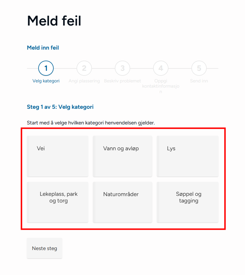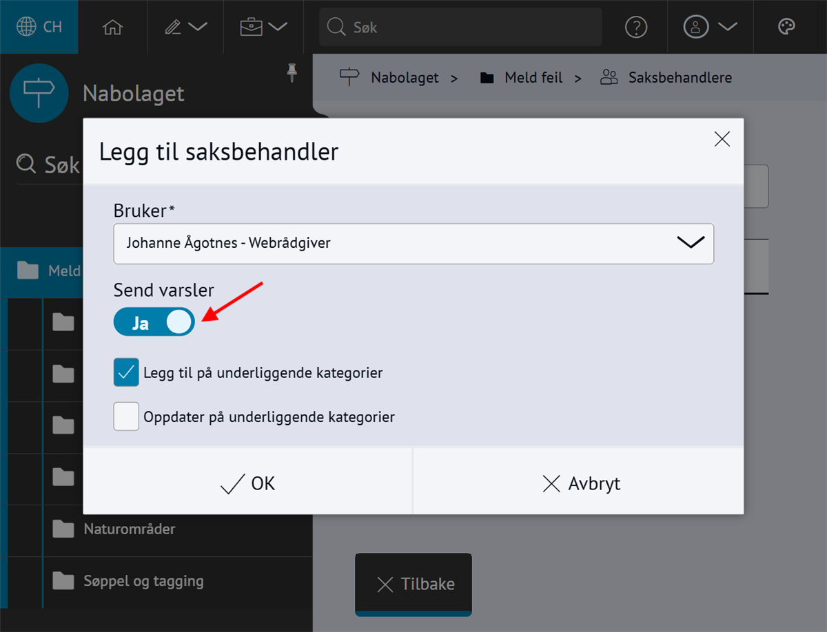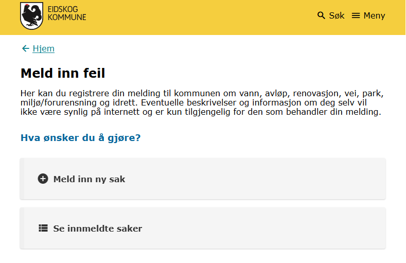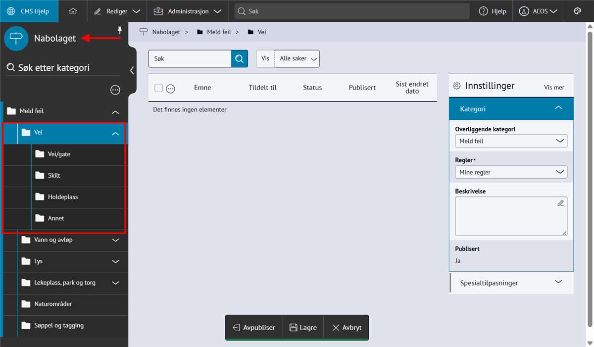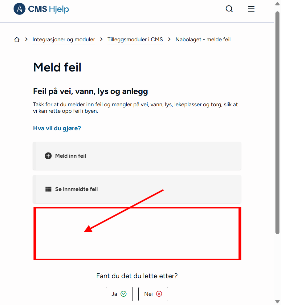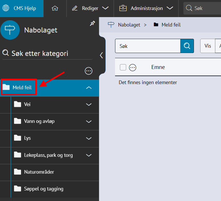 Nabolaget - meld feilMed Nabolaget kan innbyggerne melde inn feil, for eksempel om vei og utemiljø. Modulen styres av regelsett og kategorier, og saker rutes til saksbehandlere med e-postvarsling. Steg for steg Inspirasjon Bestill Sette opp NabolagetNår du setter opp Nabolaget må du gjøre fire steg:Opprett menypunktLag regelsettOpprett kategorier for å melde feilLegg til saksbehandlere 💡 Slik kan nabolaget kan se ut på ditt nettsted 1. Opprett menypunktFørst oppretter du et menypunkt der du ønsker at funksjonen for å melde feil skal skal bo. Klikk på flervalgsknappen (…) og Nytt menypunktNavngi det Meld feilVelg lenketype: Intern lenkeHva vild du lenke til: NabolagetkategoriVelg nabolagetkategori: Meld feilKlikk Lagre og PubliserTips!💡Legg “Meld feil og mangler” under:Kontakt ossVei og kollektivVei, vann og avløpKultur, idrett og fritid… eller andre logiske steder brukeren din går for å melde feil.2. Sette opp regelsettEndre regler, standardtekster, titler og navn på innmeldingsknappene for å tilpasse ditt nettsted.Gå til Administrasjon → pil-ikon på Nabolaget → ReglerÅpne Mine regler Klikk Legg til på alle feltene og RedigerKlikk Lagre og Publiser3. Opprett kategorier for å melde feilNå du har lagret reglene kan du lage knappene for hva brukerne kan melde inn feil på, og bygge en navigasjonsside for dette. Gå til Administrasjon → NabolagetUnder Meld feil finner du tre forhåndspubliserte knapperTrykk på flervalgsknappen(…) og Ny kategori for å opprette flere kategorier eller underkategorier for innmeldingUnder innstillinger, sjekk at Regler er knyttet til regelsettet Mine reglerKlikk Lagre og Publiser4. Legg til saksbehandlereAlle saksbehandlere må legges til som en gruppe i CMS først, deretter kan du legge dem til i Nabolaget og varsle dem. 1. Samle saksbehandlere i en gruppe og gi tilgangGå til Administrasjon → Grupper og brukereTrykk på flervalgsknappen (…) og Ny gruppe Navngi gruppen Saksbehandlere Legg til bruker og søk opp navnetKlikk OkTrykk på RettigheterGi gruppen Full tilgang på Nabolaget og Nettsted. Andre rettigheter kan stå til Ingen.Klikk fort stort bilde2. Legg til saksbehandlereGå til Administrasjon → NabolagetVelg kategorien Meld feilTrykk på flervalgsknappen (…) på kategorien og Saksbehandlere → Legg til saksbehandlerSøk opp saksbehandlerSend varsler: Huk Ja hvis saksbehandler skal bli varslet på e-postLegg til på underliggende kategorier hvis saksbehandler skal saksbehandler alle kategoriene under den du har markertOppdater på underliggende kategorier hvis (……………………………..)Klikk OkKlikk for stort bilde Obs! Ikke bli forvirret om du ikke ser saksbehandlerne du har lagt inn med det samme, og kun en tilbakeknapp. Du finner dem ved å trykke på flervalgsknappen (…) og Saksbehandlere. 3. Varsle saksbehandlereSjekk at den generelle varslingen er skrudd på:Gå til Administrasjon → pil-ikon på Nabolaget → ReglerÅpne Mine regler Under Regler for varsler, klikk RedigerHuk av Varsle saksbehandlere ved opprettelse av nye sakerKlikk LagreKlikk for stort bildeSjekk at varslingen per saksbehandler er skrudd på:Gå til Administrasjon → NabolagetVelg kategorien Meld feilTrykk på flervalgsknappen (…) på kategorien og Saksbehandlere Åpne saksbehandlerSe at Send varsler er skrudd påKlikk for stort bildeHurtigguide for Nabolaget Tittel og ingressKlikk for stort bildeEndre tittel på sidenGå til Administrasjon → NabolagetHøyreklikk og endre navn på menypunktKlikk for stort bildeKlikk for stort bildeKlikk for stort bildeEndre undertittelGå til Administrasjon → pil-ikon på Nabolaget → ReglerÅpne Mine reglerKlikk Rediger på Generelle regler for presentasjonEndre feltet Overskrift på startsideKlikk for stort bildeKlikk for stort bildeEndre ingressGå til Administrasjon → pil-ikon på Nabolaget → ReglerÅpne Mine reglerKlikk Rediger på Generelle regler for presentasjonEndre feltet Informasjonstekst på startsideKlikk for stort bildeKlikk for stort bildeEndre spørsmålGå til Administrasjon → pil-ikon på Nabolaget → ReglerÅpne Mine reglerKlikk Rediger på Generelle regler for presentasjonEndre feltet Overskrift over knapper på startsideKlikk for stort bildeKlikk for stort bildeFlere kategorier for innmeldingKlikk for stort bildeSlik lager du flere kategorier for innmelding:Gå til Administrasjon → NabolagetUnder Meld feil endrer du navn på knappene Trykk på flervalgsknappen(,,,) og Endre tittelKlikk for stort bildeFlere knapper under "Meld inn feil" og "Se innmeldte skjema"Klikk for stort bildeFørst lager du lenkene du vil vise:Gå til Administrasjon → LenkerKlikk på flervalgsknappen(…) og opprett kategori NabolagetKlikk på Ny lenke og legg til det du vil viseSå kobler du lenkene til nabolagetGå til Administrasjon → pil-ikon på Nabolaget → ReglerÅpne Mine reglerKlikk Rediger på Generelle regler for presentasjonFinn feltet Ekstra lenker som vises på knapper for startsideHent opp lenkekategorien NabolagetKlikk for stort bildeKlikk for stort bildeAutomatisk publisering av saker og levetidGå til Administrasjon → pil-ikon på Nabolaget → ReglerÅpne Mine reglerKlikk Rediger på Regler for automatisk publisering av sakerVelg om saker publiseres uten godkjenning eller må godkjennesVelg hvor lenge en sak vises på nettsiden: et døgn, en uke, en måned, et år eller aldriKlikk LagreKlikk for stort bildeKlikk for stort bildeStartlokasjon på kartetGå til Administrasjon → pil-ikon på Nabolaget → ReglerÅpne Mine reglerKlikk Rediger på Regler for kartZoom til ønsket utsnitt og klikk Lagre/PubliserKlikk for stort bildeKlikk for stort bildeObligatorisk med kontaktinfoGå til Administrasjon → pil-ikon på Nabolaget → ReglerÅpne Mine reglerKlikk Rediger på Regler for innsenderHuk av de tre feltene Klikk for stort bildeKlikk for stort bildeBehandle sakerMotta og tildeleSaksbehandler mottar e-post med lenke til saken i CMSKlikk på lenk