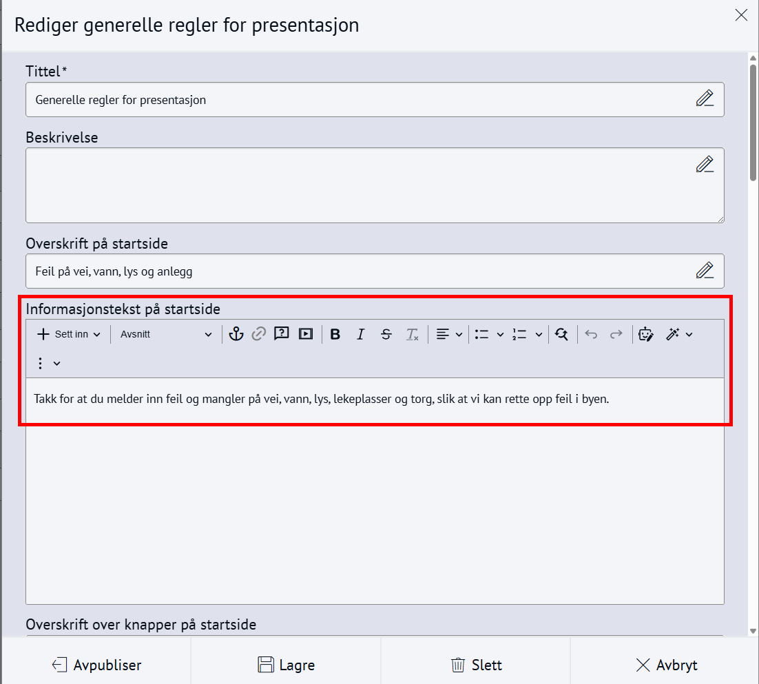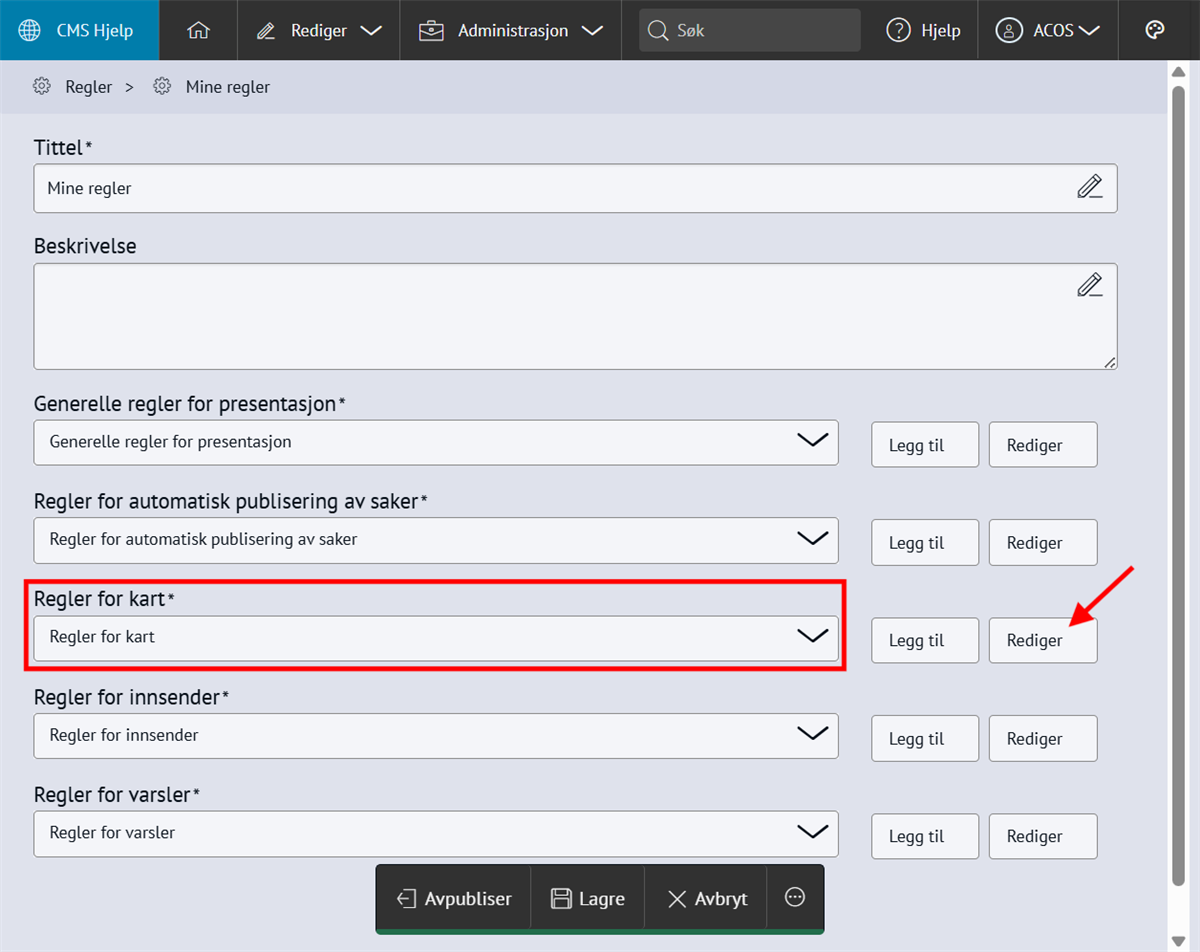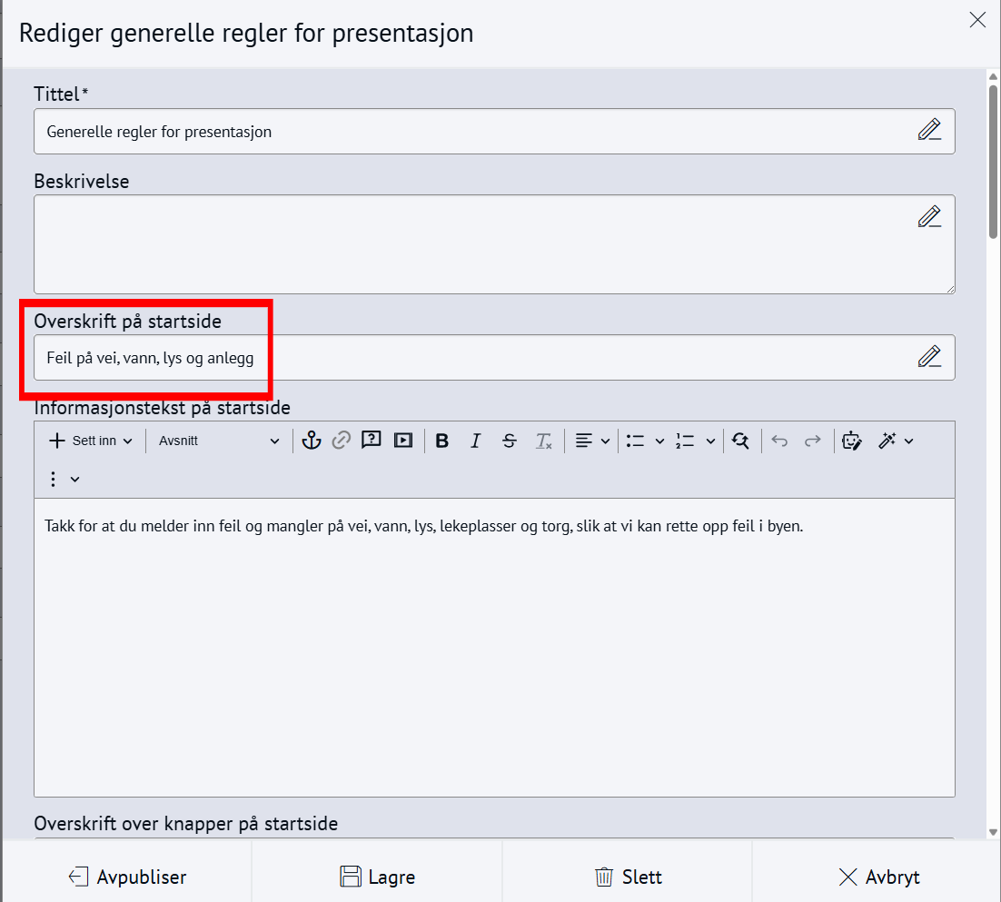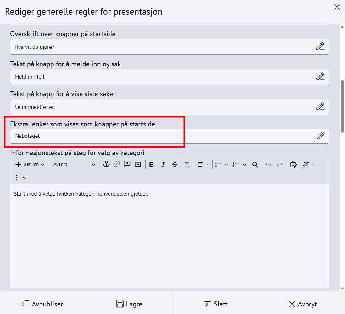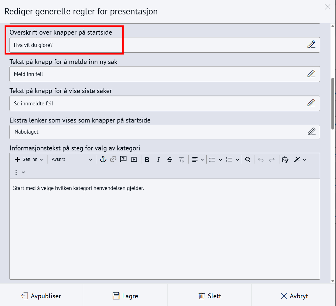Nabolaget - meld feilMed Nabolaget kan innbyggerne melde inn feil, for eksempel om vei og utemiljø. Modulen styres av regelsett og kategorier, og saker rutes til saksbehandlere med e-postvarsling. Steg for steg Inspirasjon Bestill Sette opp NabolagetNår du setter opp Nabolaget må du gjøre fire steg:Opprett menypunktLag regelsettOpprett kategorier for å melde feilLegg til saksbehandlere 💡 Slik kan nabolaget kan se ut på ditt nettsted 1. Opprett menypunktFørst oppretter du et menypunkt der du ønsker at funksjonen for å melde feil skal skal bo. Klikk på flervalgsknappen (…) og Nytt menypunktNavngi det Meld feilVelg lenketype: Intern lenkeHva vild du lenke til: NabolagetkategoriVelg nabolagetkategori: Meld feilKlikk Lagre og PubliserTips!💡Legg “Meld feil og mangler” under:Kontakt ossVei og kollektivVei, vann og avløpKultur, idrett og fritid… eller andre logiske steder brukeren din går for å melde feil.2. Sette opp regelsettEndre regler, standardtekster, titler og navn på innmeldingsknappene for å tilpasse ditt nettsted.Gå til Administrasjon → pil-ikon på Nabolaget → ReglerÅpne Mine regler Klikk Legg til på alle feltene og RedigerKlikk Lagre og Publiser3. Opprett kategorier for å melde feilNå du har lagret reglene kan du lage knappene for hva brukerne kan melde inn feil på, og bygge en navigasjonsside for dette. Gå til Administrasjon → NabolagetUnder Meld feil finner du tre forhåndspubliserte knapperTrykk på flervalgsknappen(…) og Ny kategori for å opprette flere kategorier eller underkategorier for innmeldingUnder innstillinger, sjekk at Regler er knyttet til regelsettet Mine reglerKlikk Lagre og Publiser4. Legg til saksbehandlereAlle saksbehandlere må legges til som en gruppe i CMS først, deretter kan du legge dem til i Nabolaget og varsle dem. 1. Samle saksbehandlere i en gruppe og gi tilgangGå til Administrasjon → Grupper og brukereTrykk på flervalgsknappen (…) og Ny gruppe Navngi gruppen Saksbehandlere Legg til bruker og søk opp navnetKlikk OkTrykk på RettigheterGi gruppen Full tilgang på Nabolaget og Nettsted. Andre rettigheter kan stå til Ingen.Klikk fort stort bilde2. Legg til saksbehandlereGå til Administrasjon → NabolagetVelg kategorien Meld feilTrykk på flervalgsknappen (…) på kategorien og Saksbehandlere → Legg til saksbehandlerSøk opp saksbehandlerSend varsler: Huk Ja hvis saksbehandler skal bli varslet på e-postLegg til på underliggende kategorier hvis saksbehandler skal saksbehandler alle kategoriene under den du har markertOppdater på underliggende kategorier hvis (……………………………..)Klikk OkKlikk for stort bilde Obs! Ikke bli forvirret om du ikke ser saksbehandlerne du har lagt inn med det samme, og kun en tilbakeknapp. Du finner dem ved å trykke på flervalgsknappen (…) og Saksbehandlere. 3. Varsle saksbehandlereSjekk at den generelle varslingen er skrudd på:Gå til Administrasjon → pil-ikon på Nabolaget → ReglerÅpne Mine regler Under Regler for varsler, klikk RedigerHuk av Varsle saksbehandlere ved opprettelse av nye sakerKlikk LagreKlikk for stort bildeSjekk at varslingen per saksbehandler er skrudd på:Gå til Administrasjon → NabolagetVelg kategorien Meld feilTrykk på flervalgsknappen (…) på kategorien og Saksbehandlere Åpne saksbehandlerSe at Send varsler er skrudd påKlikk for stort bildeHurtigguide for Nabolaget Tittel og ingressKlikk for stort bildeEndre tittel på sidenGå til Administrasjon → NabolagetHøyreklikk og endre navn på menypunktKlikk for stort bildeKlikk for stort bildeKlikk for stort bildeEndre undertittelGå til Administrasjon → pil-ikon på Nabolaget → ReglerÅpne Mine reglerKlikk Rediger på Generelle regler for presentasjonEndre feltet Overskrift på startsideKlikk for stort bildeKlikk for stort bildeEndre ingressGå til Administrasjon → pil-ikon på Nabolaget → ReglerÅpne Mine reglerKlikk Rediger på Generelle regler for presentasjonEndre feltet Informasjonstekst på startsideKlikk for stort bildeKlikk for stort bildeEndre spørsmålGå til Administrasjon → pil-ikon på Nabolaget → ReglerÅpne Mine reglerKlikk Rediger på Generelle regler for presentasjonEndre feltet Overskrift over knapper på startsideKlikk for stort bildeKlikk for stort bildeFlere kategorier for innmeldingKlikk for stort bildeSlik lager du flere kategorier for innmelding:Gå til Administrasjon → NabolagetUnder Meld feil endrer du navn på knappene Trykk på flervalgsknappen(,,,) og Endre tittelKlikk for stort bildeFlere knapper under "Meld inn feil" og "Se innmeldte skjema"Klikk for stort bildeFørst lager du lenkene du vil vise:Gå til Administrasjon → LenkerKlikk på flervalgsknappen(…) og opprett kategori NabolagetKlikk på Ny lenke og legg til det du vil viseSå kobler du lenkene til nabolagetGå til Administrasjon → pil-ikon på Nabolaget → ReglerÅpne Mine reglerKlikk Rediger på Generelle regler for presentasjonFinn feltet Ekstra lenker som vises på knapper for startsideHent opp lenkekategorien NabolagetKlikk for stort bildeKlikk for stort bildeAutomatisk publisering av saker og levetidGå til Administrasjon → pil-ikon på Nabolaget → ReglerÅpne Mine reglerKlikk Rediger på Regler for automatisk publisering av sakerVelg om saker publiseres uten godkjenning eller må godkjennesVelg hvor lenge en sak vises på nettsiden: et døgn, en uke, en måned, et år eller aldriKlikk LagreKlikk for stort bildeKlikk for stort bildeStartlokasjon på kartetGå til Administrasjon → pil-ikon på Nabolaget → ReglerÅpne Mine reglerKlikk Rediger på Regler for kartZoom til ønsket utsnitt og klikk Lagre/PubliserKlikk for stort bildeKlikk for stort bildeObligatorisk med kontaktinfoGå til Administrasjon → pil-ikon på Nabolaget → ReglerÅpne Mine reglerKlikk Rediger på Regler for innsenderHuk av de tre feltene Klikk for stort bildeKlikk for stort bildeBehandle sakerMotta og tildeleSaksbehandler mottar e-post med lenke til saken i CMSKlikk på lenk