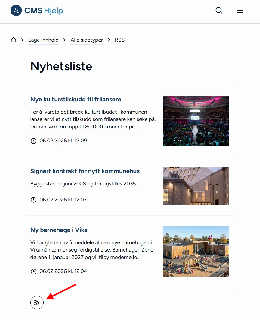 RSS-strøm Du kan generere en RSS-strøm av artiklene på nettsiden. En RSS-strøm gjør det mulig for brukere å abonnere på nyheter/artikler fra nettsiden. Kort forklart 💡En RSS-strøm, ofte bare kalt RSS-feed, er en enkel måte å abonnere på innhold fra en nettside uten at du trenger å besøke selve nettsiden for å sjekke om det har kommet noe nytt.Lag en RSS-strømDu kan kun opprette RSS-strøm på menypunkter av typen Side med flere artikler. Marker et menypunkt av typen Side med flere artikler Under Innstillinger klikk på MenypunktVelg Ja for RSS Klikk Lagre og PubliserKlikk for stort bildeFå varsler om nye artiklerNederst på nettsiden vil det nå vise et ikon for RSSKlikk for stort bilde Merk! De som ønsker å abonnere på innholdet fra denne siden trenger en RSS-leser i nettleser som varsler hver gang det kommer nye artikler under dette menypunktet. Legg inn en RSS-feed i artikkel Klikk i brødteksten der du vil plassere innholdetVelg +Sett inn → Widget Velg +Opprett ny og gi den en Tittel, for eksempel RSS-strømVelg Type: RSS-strømLim inn adressen til RSS-strømmenVelg visning og antall elementerUnder innstillinger, legg til i en kategoriKlikk Publiser og OkSlik ser RSS-feed ut i Widget