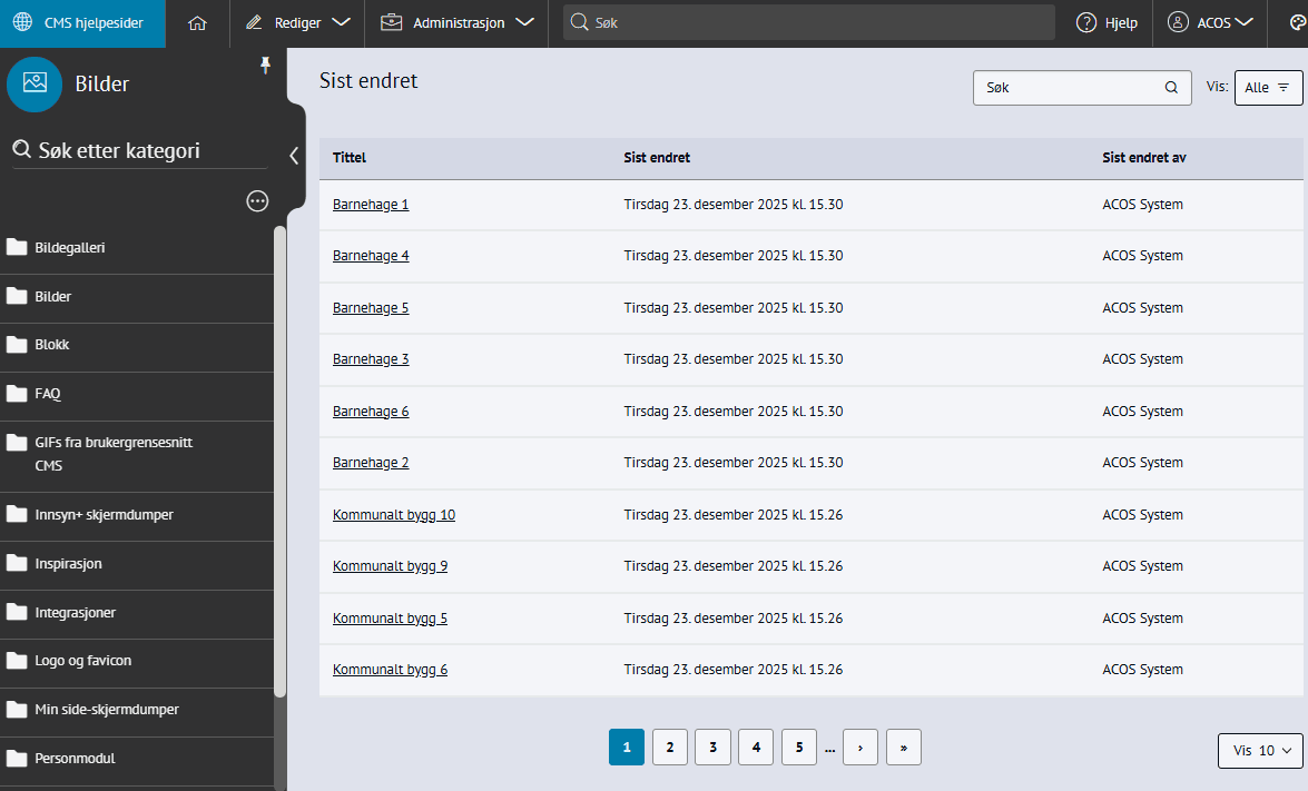 BildegalleriLage og redigere bildegalleri. Steg for steg Inspirasjon Bestill Lage et bildegalleriGå til artikkelen og klikk i brødteksten der du vil plassere bildegallerietVelg +Sett inn og velg BildegalleriVelg +Opprett ny og gi det en TittelUnder Kategori velger du en plassering eller oppretter en nyVelg galleritype:SliderSlider med fade-effektBilder i rutenettMiniatyrbilderKlikk Legg til bilderVelg eksisterende bilder eller last opp nyeKlikk Ferdig når du har markert bildene du vil ha medFor å redigere bildeinnstillingene, klikk Endre bilderKlikk PubliserLagre artikkelenRedigere bildene i et bildegalleriDobbelklikk på bildegallerietKlikk RedigerKlikk Endre bilderEndre bildetekst: Klikk på hvert bilde og gjør endringer i feltet til høyreEndre alternativ tekst: Klikk på hvert bilde og gjør endringer i feltet til høyreEndre bildeutsnitt: Klikk på blyanten på bildene og velge Endre bildeutsnittLegge til flere bilder: Klikk på Legg til bilderFjerne bilder: Klikk på Søppelkasse-ikonet på bildeneEndre rekkefølge: Dra og slipp bildene i den rekkefølgen du ønskerEndre rekkefølge på bildegalleri Se hvor modulen er i brukDu kan enkelt sjekke om modulen er i bruk eller ikke.Gå til Rediger > velg modulen du vil sjekkeVelg en kategoriKlikk på flervalgsknappen (...) Velg Hvor i brukTrykk på bildet for større visning. Når bør du bruke bildegalleri?En generell anbefaling er å bruke bilder eller bildegalleri når det gir merverdi til teksten og hjelper brukerne å finne svar på det de lurer på. Der bilder ikke gi merverdi til teksten og fungerer som pynt, anbefaler vi å fjerne bildene. Se flere tips under bilder.Et bildegalleri kan fungere fint til for eksempel:Nye bygg ✅ Arrangementer ✅ Kunstprosjekter ✅ Se de fire ulike typene av bildegalleriSlider Slider med fade-effekt Miniatyrbilder Bilder i rutenett Integrasjoner til bildebanker er tilleggsfunksjonalitet i ACOS CMS. Ta kontakt hvis du ønsker tilbud på integrasjon til Mediaflow og Imageshop. Denne modulen er standard funskjonalitet i ACOS CMS. Se flere moduler du kan bestille. Kom i gang med modulenTrenger du hjelp til å ta i bruk funksjonaliteten på en god måte? Bestill en time med konsulent for rådgivning, eller delta i våre webinarer.