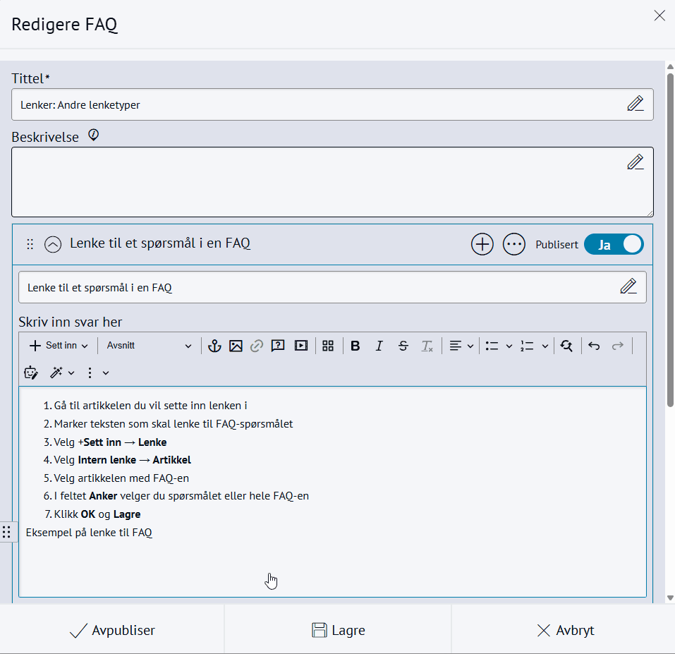 FAQEn FAQ er en samling av ofte stilte spørsmål og svar, der du kan åpne og lukke svarene. Steg for steg Inspirasjon Bestill Lage en FAQGå til artikkelen og klikk i brødteksten der du vil plassere FAQVelg +Sett inn → FAQVelg +Opprett ny og gi den en TittelKlikk på Nytt spørsmål og fyll inn tekstKlikk Lagre eller Publiser Spørsmål er navnet på åpne/lukke-boksenSvar er teksten som vises når brukeren åpner boksen. 👉 Bruk FAQ med omhu. Viktig informasjon bør fortsatt stå som vanlig tekst i artikkelen med mellomtitler i Overskrift 2, og ikke skjules inni en FAQ. Redigere en FAQRedigere FAQDu kan endre en FAQ på to måter:Åpne artikkelen og dobbeltklikke på veiviseren Gå til Rediger → FAQKopiere FAQKopiere spørsmålKlikk på steget du vil kopiereKlikk på flervalgsknappen (...)Klikk på Lag kopiGi spørsmålet et nytt navn eller flytt det til en annen FAQKopiere hele FAQGå til Rediger → FAQKlikk på flervalgsknappen (...)Klikk på Lag kopiFlytte FAQEndre rekkefølge på spørsmålKlikk og dra flyttikonetSlipp mellom de andre spørsmåleneKlikk LagreFlytte spørsmål til annen FAQFinn spørsmålet det gjelderI oversikten over spørsmål, klikk på flervalgsknappen(...) ved siden av det aktuelle spørsmåletKlikk på Flytt til kategoriVelg den FAQ-en du ønsker å flytte spørsmålet tilKlikk OKEndre navn på FAQHold musen over en FAQKlikk på flervalgsknappen (...)Klikk på Endre tittelSkriv inn et nytt navn og trykk EnterSlette stegKlikk på steget du vil sletteKlikk på flervalgsknappen (...)Velg Slett og bekreft med OKOfte stilte spørsmål og feilsøking Kan jeg lenke direkte til et spørsmål i FAQ? Gå til Rediger → FAQ eller dobbeltklikk på FAQ-en i artikkelenMarker teksten som skal lenke til FAQ-spørsmåletVelg +Sett inn → Lenke eller trykk på lenkesymbolet. Merk at du bare får trykket på denne når du har markert teksten du skal lenke.Velg Intern lenke → ArtikkelVelg artikkelen som FAQ-en ligger i alleredeI feltet Anker søker du opp spørsmålet eller hele FAQ-enKlikk OK og LagreSe eksempel på lenke til FAQKan jeg bruke et spørsmål i flere forskjellige FAQ-er?Nei, det er dessverre ikke mulig.Det du kan gjøre er å lage en egendefinert og legge svaret inni denne. Da trenger du bare å oppdatere svaret ett sted.Åpne FAQ-en du vil endre og gå til feltet Skriv inn svar herTrykk på Sett inn → EgendefinertTrykk på +Opprett ny og gi den en tittelI feltet Design skriver du svaret på din FAQ og LagrePubliser når den er klarÅpne den andre FAQ-en du ønsker å vise spørsmålet og svaret i, og legg til et nytt spørsmål og egendefinert i feltet Skriv inn svar her.Nå vises altså svaret to steder i to ulike FAQ-er, men du trenger bare oppdatere det ett sted som er i egendefinert.Kan jeg bruke H2 eller H3 inne i en FAQ?Du bør helst holde innholdet i FAQ-spørsmålene kort og gjerne kun benytte deg av Normal-formateringen. Dersom du bruker overskriftsformatene Overskrift 2 eller Overskrift 3 så er det ikke sikkert disse blir i en riktig, hierarkisk rekkefølge slik det er anbefalt. Overskriftene vil nemlig fungere som underoverskrifter for selve FAQ-en, ikke FAQ-spørsmålet, så for leseverktøy vil rekkefølgen være litt ute av kontekst. Likevel, hvis du fortsatt har behov for å dele opp innholdet i avsnitt med overskrifter så anbefaler vi å bruke Overskrift 3, da FAQ-ens tittel automatisk får Overskrift 2 som formatering. Se hvor modulen er i brukDu kan enkelt sjekke om modulen er i bruk eller ikke.Gå til Rediger > velg modulen du vil sjekkeVelg en kategoriKlikk på flervalgsknappen (...) Velg Hvor i brukTrykk på bildet for større visning. Bruk FAQ slikDetaljer om et tema ✅ Læretid i Europa Hva er rollen til min norske lærebedrift mens jeg er i utlandet?En lærebedrift som har en lærling utplassert i utlandet er fremdeles ansvarlig for opplæringen. Vi oppmuntrer lærlinger å dele sine opplevelser med lærebedriften hjemme i Norge slik at lærebedriften også kan lære av oppholdet.Får jeg lønn under oppholdet?Den norske bedriften er ikke forpliktet til å betale lønn under oppholdet. Du må selv avklare og avtale det med din lærebedrift i Norge. Vær oppmerksom på at de fleste lærlingene ikke får lønn under oppholdet. Du får heller ikke lønn fra bedriften i vertslandet.Akershus fylkeskommune vil ikke dekke eventuelle utgifter i Norge, for eksempel bolig.Det er mulig å få stipend fra Lånekassen. Søk stipend hos Lånekassen.Hvordan vil jeg bo i utlandet?Vi skaffer enten leilighet, som vanligvis deles med andre, eller vertsfamilie til deg. Du vil få alltid få ditt eget rom. Du får ikke muligheten til å velge hvordan du vil bo. Vær oppmerksom på at boligstandard varierer fra land til land. Får jeg dekket utgifter jeg har i Norge?Nei. Akershus fylkeskommune vil ikke dekke eventuelle utgifter i Norge, for eksempel bolig og forsikringer.Det er mulig å få stipend fra Lånekassen. Søk stipend hos Lånekassen.Er jeg dekket av en forsikring?Ja. Du er dekket gjennom Akershus fylkeskommunes forsikringer: yrkesskadeforsikring, reiseforsikring og ansvarsforsikring. Les mer om elevforsikringen du er dekket av.Eksempelet er hentet fra Akershus fylkeskommune ✅Informasjon som kun gjelder noen få brukere FRAM-appen Eg har tekniske problem med FRAM-appen Start appen på nytt: Lukk appen heilt, og opne den igjen. Start telefonen på nytt: Slå av telefonen og slå den på igjen. Oppdatere appen: Sjekk om du har den nyaste versjonen av appen i App Store eller Google Play.Logg inn på nytt: logg heilt ut av appen, og logg inn igjen.Vi anbefaler at du slår på automatisk oppdatering i telefoninnstillingane dine. Om dette ikkje hjelper, ta kontakt med vårt kundesenter via kontaktskjemaet. Korleis slettar eg kontoen min? Om du ønsker å slette kontoen din kan dette gjerast i appen. Gå til Min profil og vidare til Rediger min profil. Der finn du ein knapp som heiter Slett min profil. Merk: Ikkje slett prfilen din om du 