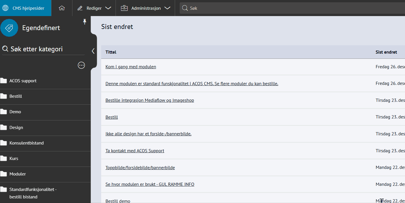 FilerLast opp, publisere, bytte og slette filer. Filer Steg for steg Inspirasjon Bestill Sette inn fil i artikkelGå til artikkelen og klikk i brødteksten der du vil plassere filenVelg +Sett inn og velg FilVelg Last opp filVelg kategori eller lag en ny filmappe på + Ny kategoriGi filen en TittelKlikk OkSette inn filgalleriGå til artikkelen og klikk i brødteksten der du vil plassere filenVelg +Sett inn og velg FilgalleriVelg Filkategorien som skal visesVelg kategori eller lag en ny filmappe på + Ny kategoriGi filen en TittelKlikk Ok og Lagre 💡 Tips: Vise filer i filtervisningHvis du har tilleggsmodulen Filtervisning kan du vise filer i en oversikt med filtrering. Se hjelpesiden for filtervisning. [sett inn lenke til filterartikkelen her] Redigere filer Bytte filGå til Rediger → FilerVelg filkategori filen ligger i og velg filenKlikk Bytt filNå endres filen alle steder den er lenket til på nettstedet. Kopiere filDu kan ikke kopiere en fil i CMS.Du må laste den ned, og så laste den opp på nytt.Endre rekkefølgeEndre rekkefølgen i filgalleriGå til Rediger → FilerVelg filkategorien du vil endre rekkefølge iEndre til Manuell i innstillingene til høyreKlikk LagreDra og slipp filene i ønsket plassering i listen Klikk LagreLenke til filMarker teksten som skal være lenkenVelg Sett inn > LenkeUnder Hva vil du lenke til, velg FilerVelg ønsket fil eller last opp nyKlikk OK og LagreSlette filSlette én filGå til Rediger > FilerFinn filen du vil sletteKlikk (…)-knappen > SlettBekreft med ✓ OKSlettede filer flyttes til papirkurven og kan gjenopprettes der.Slette flere filer samtidigMarker filene med avkrysningsbokseneKlikk (…)-knappen øverstVelg Slett og bekreftOfte stilte spørsmål og feilsøking Hvor store filer kan jeg laste opp?Standard grense er 50 MB. Har du behov for å øke filstørrelsen? Ta kontakt med ACOS Support. Hvorfor vises ikke filen i søket?Filen må være publisert og i bruk (lenket til en artikkel eller modul).Kan jeg fjerne filstørrelsen i lenketeksten?Nei. Filstørrelse vises automatisk av hensyn til universell utforming. Ønsker du et annet design? Ta kontakt med ACOS Support for å bestille. FIlen dukker ikke opp i søkEmnetypen Fil må være Søkbar. Dette gjør du via Rediger → EmnetypeFilen må være publisert og i bruk. Den må altså være koblet/lenket til innhold Når en fil lastes opp i ACOS CMS får den status som publisert. Den må i tillegg være "i bruk" (koblet noe). Finnes den bare som en publisert fil uten referanser dukker den ikke opp i søkeresultatet. Se hvor modulen er i brukDu kan enkelt sjekke om modulen er i bruk eller ikke.Gå til Rediger > velg modulen du vil sjekkeVelg en kategoriKlikk på flervalgsknappen (...) Velg Hvor i brukTrykk på bildet for større visning. Tips!💡 Husk at filer du laster opp må være universelt uformet. Legger du filene inn i dokumentleseren blir de universelt utformet og i tillegg kan du laste dem ned som PDF-filer. Strategier innen arbeidsliv ✅PDF-ene hentet fra Regjeringen.no og er satt inn i et filgalleri: ArbeidslivArbeidslivTittel Type Størrelse Srategi mot arbeidslivskriminalitetPDF218 kBStrategi mot arbedslivskriminalitet 2019PDF444 kBArbeidsgiverstrategiPDF2 MBForebyggingsstrategiPDF3 MBArbeidsgiverstrategi revidertPDF5 MBHandlingsplan mot sosial dumping og arbeidslivskriminalitetPDF6 MBNasjonal strategi for kompetansePDF6 MBStrategi for et mer likestilt utdannings- og arbeidsmarked 2021-2024PDF8 MBRevidert strategi mot arbeidslivskriminalitet 2021PDF2 MB Strategier innen arbeidsliv ✅PDF-ene hentet fra Regjeringen.no og er satt inn i en filtervisning: [sett inn filtervisning som viser filer] Søknadsskjema som filer✅Som hovedregel bør alle skjemaene dine være digitalisert, men i spesielle tilfeller kan du legge ved papirskjema som en fil hvis målgruppen har behov for det. Søk om TT-kortNår legen har sendt legeerklæring, kan du søke om TT-kort.Søk om TT-kortMangler du BankID? Bruk papirskjema: Søk om TT-kort (papirskjema) (PDF, 474 kB)Eksempelet er hentet fra Akershus fylkeskommune Denne modulen er standard funskjonalitet i ACOS CMS. Se flere moduler du kan bestille. Kom i gang med modulenTrenger du hjelp til å ta i bruk funksjonaliteten på en god måte? Bestill en time med konsulent for rådgivning, eller delta i våre webinarer.