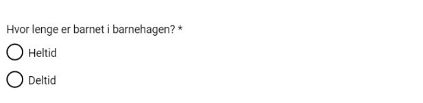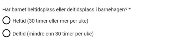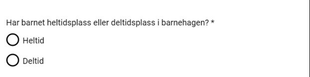 Spørsmålet "Hvor lenge er barnet i barnehagen?" inviterer egentlig til å svare med antall timer, for eksempel "10 timer", "Mer enn 30 timer", eller noe i den dur. Men de faktiske svaralternativene er en type plass barnet kan ha: “Heltid” eller “Deltid”.
