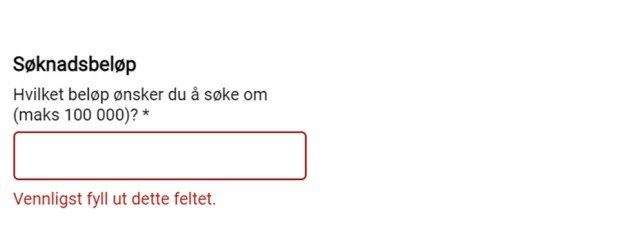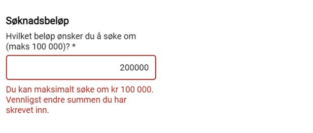 Skriv heller: “Du kan maksimalt søke om kr 100 000. Vennligst endre summen du har skrevet inn.”
