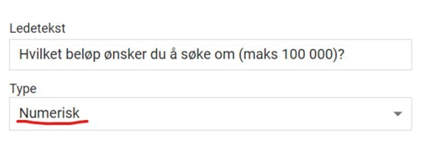 For å spinne videre på eksemplet over: I feltet for søknadssum, bør det bare være mulig å skrive inn tall, ikke bokstaver. Du vil at brukeren skal skrive “10 000”, ikke “ti tusen”. Da må du sette på en kontroll (validering) på feltet, som bare godtar at brukeren skriver inn tall, og ikke bokstaver.
