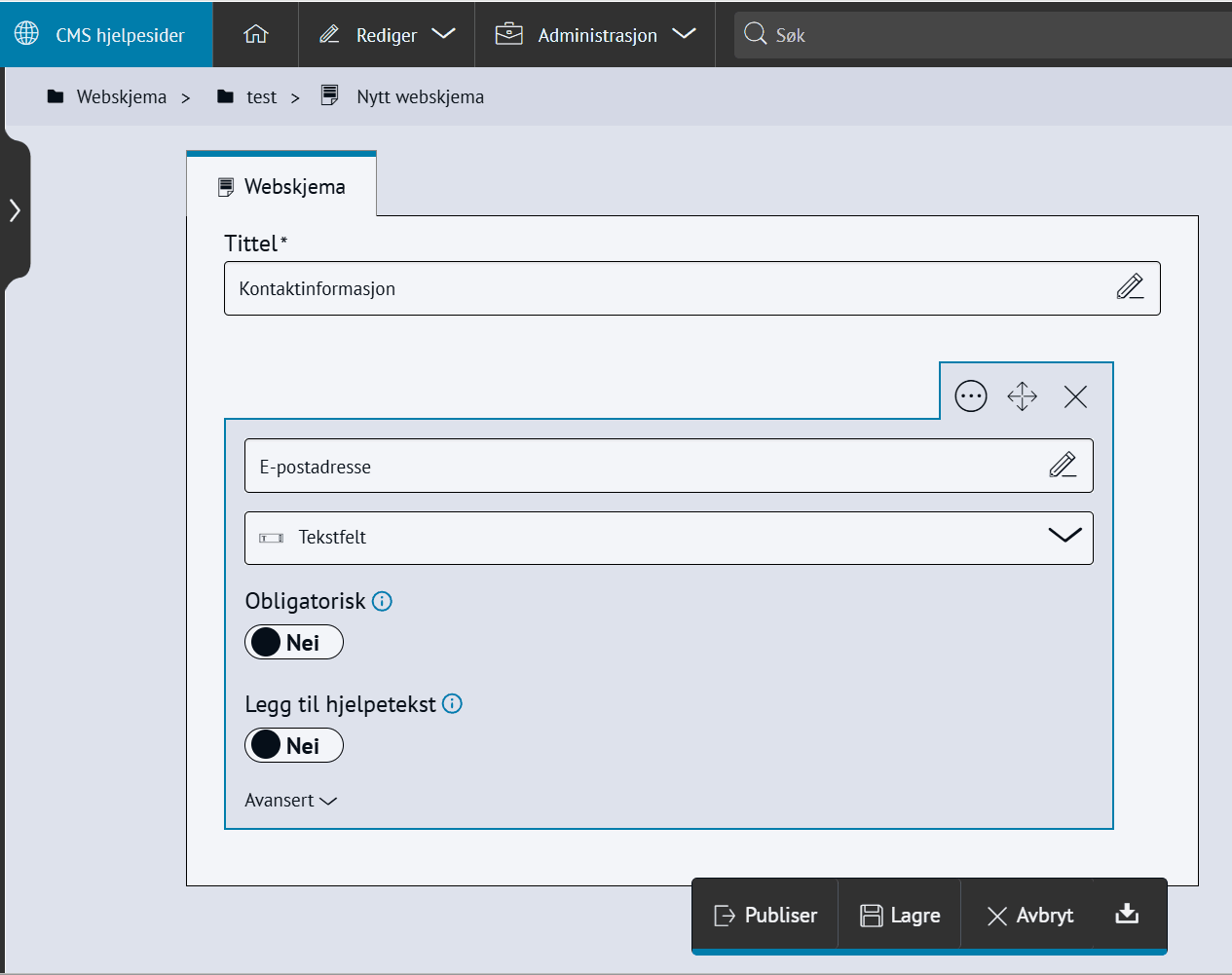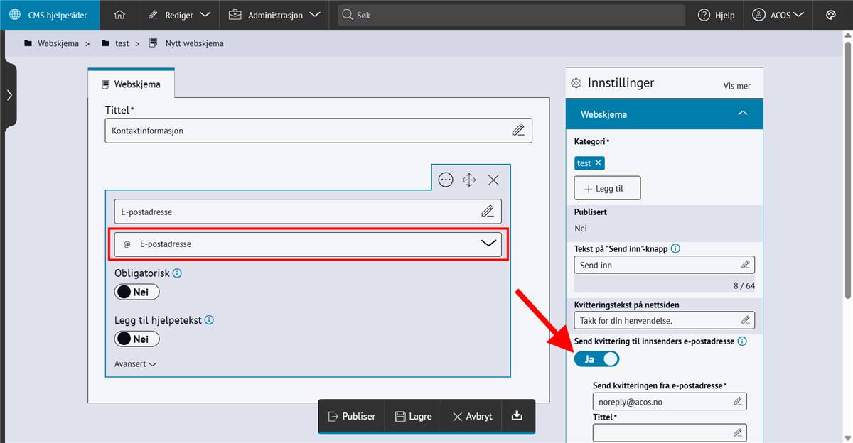 WebskjemaEt webskjema er et enkelt digitalt skjema. Du kan samle inn informasjon fra brukere og få tilsendt på e-post. Steg for steg Inspirasjon Bestill Lage et webskjemaGå til artikkelen du jobber med og klikk i brødteksten der du vil plassere webskjemaetVelg +Sett inn → WebskjemaKlikk +Opprett ny og gi det en TittelUnder Kategori velger du en plassering eller oppretter en nyKlikk + for å legge til flere felter og endre felttypeHuk av Obligatorisk hvis feltet må fylles ut før innsendingLegg til kvitteringstekst, e-postmottakere eller aktiver ReCaptcha under InnstillingerKlikk Lagre eller Publiser👉🏻 Spør kun om ting i skjemaet du trenger for å behandle henvendelsen. Samler du inn persondata må du også ha en rutine for å slette disse.Sende kvitteringFor at brukeren som fyller ut skjemaet skal få kvittering må du legge til innstillinger på skjemaet:Legg til obligatorisk felt for e-post i skjemaet:Huk av på Send kvittering til innsenders e-post:Få innsendte skjema på e-postDu kan få webskjemaene tilsendt på din e-post eller til en felles e-postadresse. Huk av for at du skal Motta webskjema på e-post:Redigere et webskjema Redigere webskjemaDu kan endre et webskjema på to måter:Åpne artikkelen og dobbeltklikke på webskjemaetGå til Rediger > WebskjemaKopiere webskjemaKopiere steg i webskjemaKlikk på steget du vil kopiereKlikk på flervalgsknappen (...)Klikk på Lag kopiKopiere hele webskjemaetGå til Rediger > WebskjemaKlikk på flervalgsknappen (...)Klikk på Lag kopiFlytte feltKlikk på steget du vil flytteKlikk og dra flyttikonetSlipp mellom de andre stegeneSlette stegKlikk på steget du vil sletteKlikk på flervalgsknappen (...)Velg Slett og OKSe innsendte skjemaÅpne svar i ExcelKlikk på fanen Respons i webskjemaetSe oversikt over alle svarKlikk på Åpne i Excel for å laste nedSend e-post til alle Klikk på fanen Respons i webskjemaetSe oversikt over alle svarKlikk på Send e-post til alle Merk! Du kan kun sende e-post til alle dersom du har bedt om en e-postadresse i webskjemaet og valget er obligatorisk. Hvis avsenderne ikke har fylt inn en e-postadresse vil det ikke være mulig å sende de en e-post. Ofte stilte spørsmål og feilsøking Jeg får feilmelding når jeg velger «Send e-post til alle»Sjekk at feltet i skjemaet er av typen E-postadresse og ikke Tekstfelt. Hvis ikke: Kopier e-postadressene via Åpne i Excel og send e-post manuelt.Innsender får ikke kvittering på e-postHusk å aktivere Send kvittering til avsender og at skjemaet inneholder feltet E-postadresse.E-poster havner i spamfilteretLegg til IP 82.134.18.219 i deres SPF-record for domenet ditt. Dette er en oppgave som IT-avdelingen der du jobber vanligvis må gjøre.Kan jeg lenke direkte til et webskjema?Nei, men du kan lenke til en artikkel der skjemaet er satt inn.Kan innsendte skjema arkiveres i ACOS WebSak?Ikke automatisk. Du kan sende svarene til e-post og arkivere manuelt. Se hvor modulen er i brukDu kan enkelt sjekke om modulen er i bruk eller ikke.Gå til Rediger > velg modulen du vil sjekkeVelg en kategoriKlikk på flervalgsknappen (...) Velg Hvor i brukTrykk på bildet for større visning. Dette kan du bruke webskjema tilGi brukerne muligheten til å medvirke✅ Eksempelet er hentet fra skalvislaaosssammen.noFå tips om feil på nettsiden✅ Eksempelet er hentet fra Enebakk kommuneBooke tid med saksbehandler✅ Eksempelet er hentet fra Bamble kommune. Viktig å huskeDe som har bruker i CMS med tilgang til webskjema-modulen kan se alle responser. Derfor: Ikke spør om sensitiv informasjon i webskjemaet.Slett responser fra webskjemaet når formålet med å samle inn svarene er oppnådd. Denne modulen er standard funskjonalitet i ACOS CMS. Se flere moduler du kan bestille. Kom i gang med modulenTrenger du hjelp til å ta i bruk funksjonaliteten på en god måte? Bestill en time med konsulent for rådgivning, eller delta i våre webinarer.